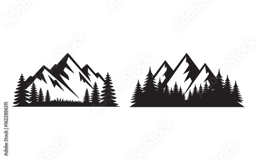 black, silhouette, mountain, peak, pine, tree, forest, landscape, nature, graphic, design, vector, illustration, wilderness, evergreen, conical, sharp, jagged, stylised, simple, clean, isolated, white background