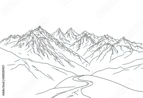 mountain, range, jagged, peak, line, art, vignetting, minimalist, design, anatomy, sharp, line, adobe, stock, style, winding, road, path, dramatic, landscape, mist, no, text