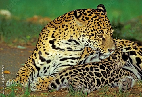 JAGUAR panthera onca, MOTHER WITH CUB SUCKLING
