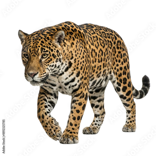 jaguar, big cat, felino, animal, mammal, predator, carnivore, wildlife, walking, prowling, stalking, movement, spot, rosette, fur, coat, isolated, white background, studio shot, powerful