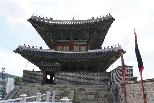 pavilion, gate, asia, korea, suwon, travel, tour tourism, sky, city, town, architecture, landscape, building, wall, history, landmark, traditional, sunny, culture, stone, fortress, ancient