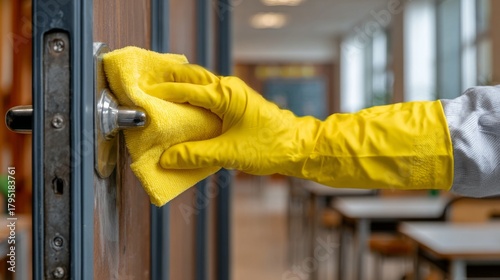 Janitor Wearing Yellow Gloves Sanitizing Classroom Doorknob with Cloth for Hygiene and Cleanliness in Educational Environment