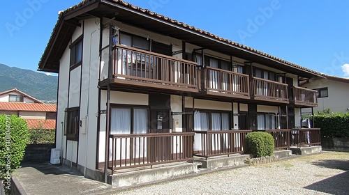 apartment, building, japan, house, rental, property, real estate, home, exterior, residential, mountain, sunny, day, view, landscape, architecture, dwelling, accommodation, lodging, balcony, terrace, window, door, roof, facades, brick, stone, wood, garden, yard, sky, clear, clean, modern, traditional, design, structure, estate, location, scene, place, area, district, neighbourhood, community