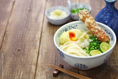 japanese cold Sanuki udon noodles on toppings with surimi tempura and soft boiled egg tempura