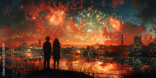 couple, tokyo, fireworks, festival, night, japan, culture, celebration, romance, skyline, vibrant, traditional, japanese, event, atmosphere, city landscape, summer, enjoyment, evening, love, city, scenic, cultural, romantic