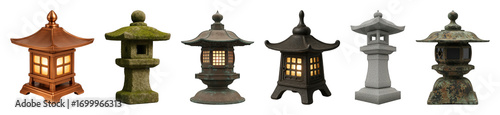 Japanese garden lantern set including copper, stone, bronze, dark metal, granite, and patinated versions isolated. Outdoor decor and lighting elements.