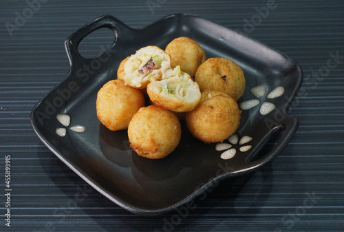 Japanese grilled takoyaki ball with octopus seafood in black plate on dark grey wood background dim sum halal menu