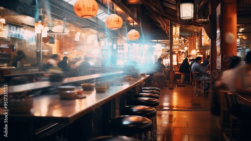 Japanese Izakaya interior with counter barstools and customers with glow bokeh long exposure motion light trails restaurant background photography