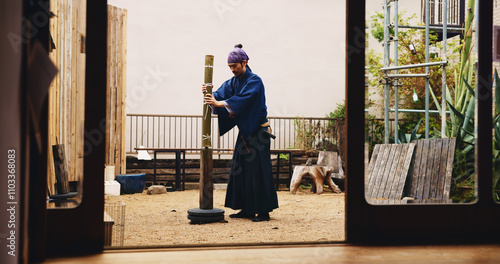 Japanese, man and martial arts with bamboo stand for samurai training, practice or tradition. Male person, kenjitsu trainer or culture with demonstration for shinkendo preparation or tameshigiri dojo