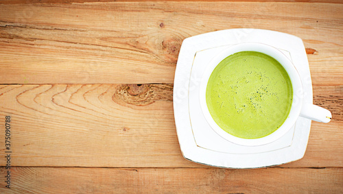 Japanese matcha green tea is poured into a white mug and on a white saucer in powder. Tea set on a textured napkin. Invigorating drink in a cafe, cooking, cheerfulness, antioxidant. space for text