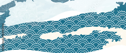 Japanese ocean wave pattern background vector. Wallpaper oriental design with sea wave pattern, watercolor texture. Illustration for banner, wall art, website, interior.