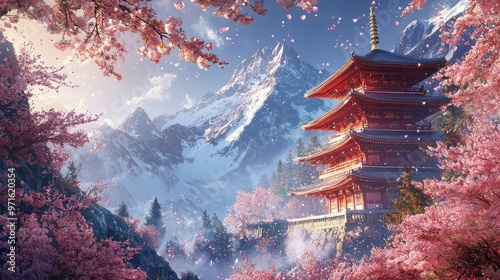 cherry blossom, nature, art, travel, range, spring, culture, destination, asian, pagoda, asia, landscape, meditation, digital, illustration, blossom, mountain, artwork, spirituality, tranquil, japanese, cherry, sakura, snowy, flower, picturesque, peaceful, beautiful, mountain, colourful, temple, scenic, zen, vibrant, serene, pink
