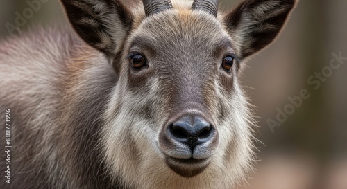 Japanese serow standing in a forested mountain habitat. A goat antelope species native to Japan, known for thick fur, short horns, and adaptability to rugged terrain.
