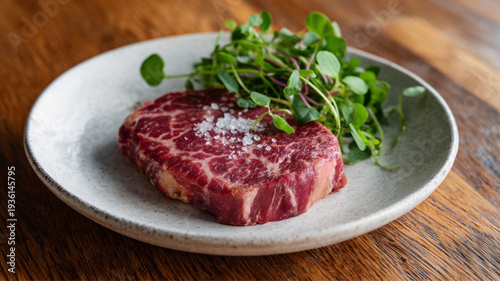 Japanese Wagyu Beef on White Plate with Micro Herbs and Sea Salt in Luxury Food Photography