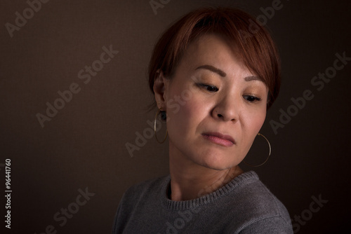 40s, asian, japanese, approachable, dark, dramatic, face, face, female, female, friendly, head shot, middle-aged, pensive, portrait, sad, serious, short hair, simple, sombre, thinking, thoughtful, woman, woman