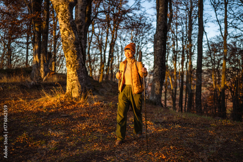 Japanese woman hiking forest during autumn sunset enjoying nature