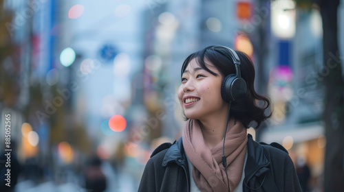Japanese woman walking smiling, using headphones, street background with tall buildings, Ai Generated Images