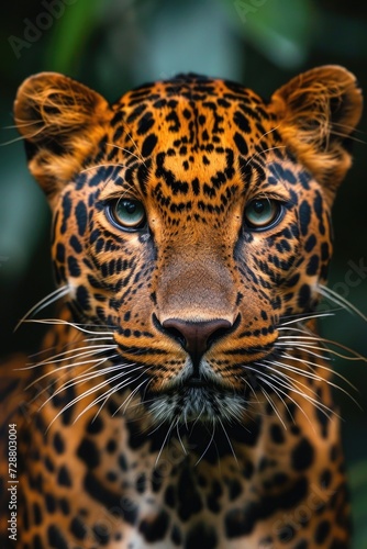 leopard, closeup, portrait, coat, rosette, gold, footed, fur, texture, palpable, whisker, detailed, dusky, background, eye, soulful, calculating, crafted, grace, environment, shadowy, underbrush, dense, rainforest, mystery, stealth, majestic, predator, shadow, camouflage, wild, mysterious, depth, essence