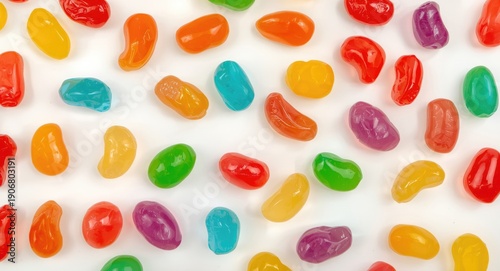Jelly beans of different bright colors lying on a white background