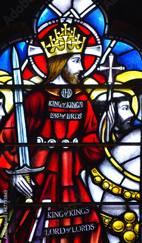 Jesus Christ as a knight on horseback. A stained glass window
