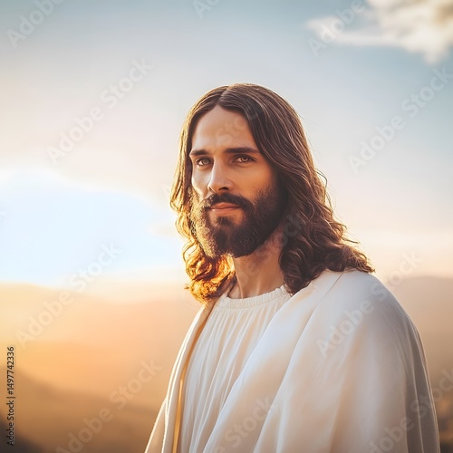 jesus christ, jesus christ, portrait, sunset, religious, image, faith, hope, spirituality, christianity, bible, belief, god, divine, holy, sacred, spiritual, man, long hair, beard, robe, peaceful, calm, serene, landscape, mountain, golden hour, light, sun, sky, christian, messiah, saviour, redeemer, hopeful
