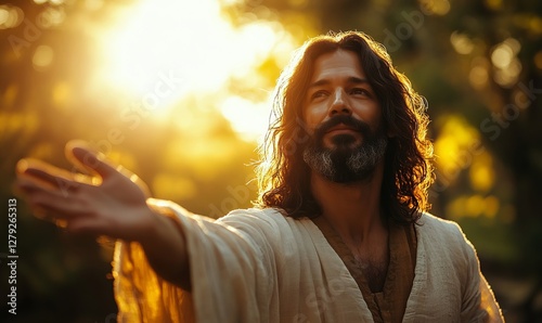 Jesus Christ reaching out with open hands, blurred background, warm sunlight, religious and spiritual imagery, concept of hope, faith, and divine