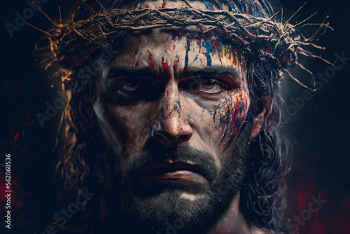 jesus christ, jesus christ, jesus christ, face, crown, thorn, thorn, bloody, blood, holy, week, light, pain, saviour, sacrifice, humankind, christian, religion, life, sin, sin, people, woman, person, dark, fashion, art, black, model, hand, generative, ai