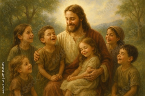 jesus christ, jesus christ, talking, children, smiling, generation, ai, teaching, blessing, love, compassion, religious, spiritual, illustration, heartwarming, biblical, scene, showing, surrounded, happy, radiating, warmth, divine, peaceful, setting, soft, heavenly, lighting