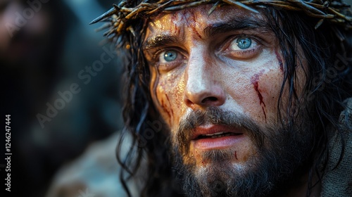 jesus christ with crown of thorns on his head in the dark looking up photorealistic portrait