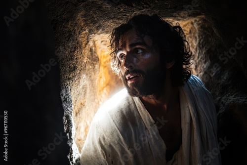 jesus christ, resurrection, tomb, emerging, light, spiritual, faith, christianity, religious, cave, biblical, robe, saviour, miracle, easter, divine, salvation, hope, sacred, belief, rebirth, triumph, nirvana, symbolism, holy, dawn, historical, inspirational, life, redemption, grace, spirituality, worship, powerful, symbolic, emergence