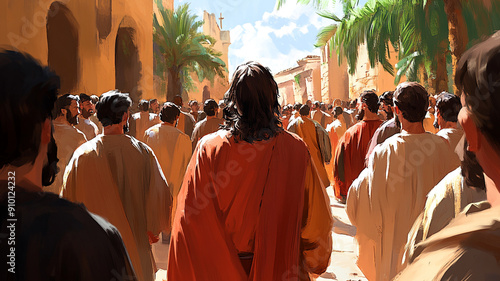 Jesus enters Nazareth on foot on Palm Sunday. Rear view. People are triumphant.
