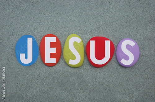 Jesus, masculine given name composed with multi colored hand painted stone letters