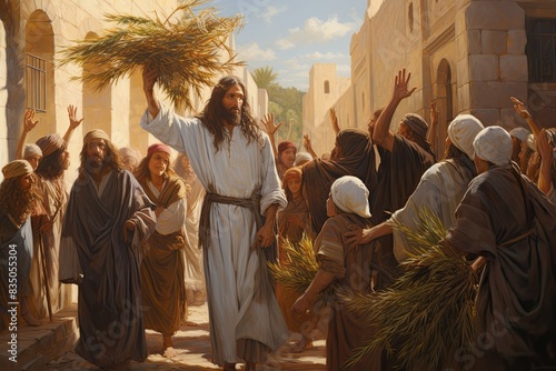 jesus walking through a crowd of people carrying a bunch of hay, An oil painting that shows the faithful hailing Jesuss arrival into Jerusalem, casting their palm leaves before his path