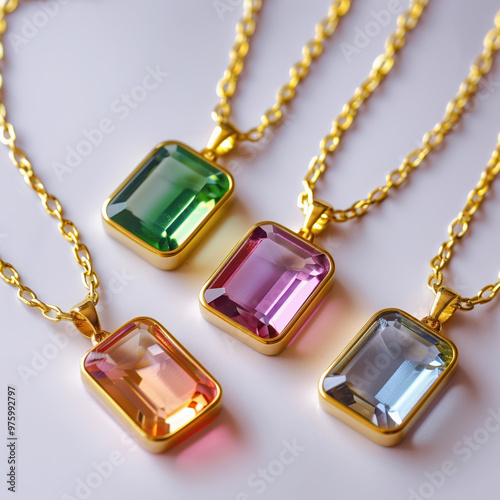 jewelry necklaces pendants gemstones gold chains accessories colorful fashion elegance luxury green pink orange blue rectangular crystals statement pieces women's jewelry