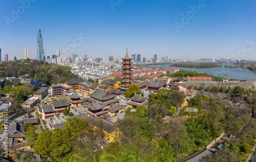 Jiming temple and skyline of urban Nanjing city