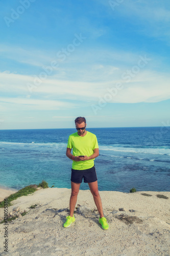 activity, athletic, beach, mobile phone, mobile phone, earbud, earphones, exercise, fit, fitness, guy, holding, cyberspace, jogger, jogging, listen, male, man, messaging, mobile, nature, ocean, outdoors, outside, pause, person, phone, recreation, run, runner, running, sea, shoe, shore, slim, smartphone, text message, sneaker, sport, summer, technology, texting, thin, training, typing, using, physical exercise, young