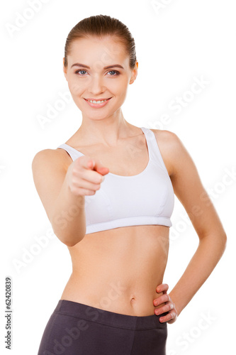 woman, female, caucasian, beautiful, isolated on white, studio shot, healthy lifestyle, well-being, beauty, sport, young adult, shape, bodycare, standing, aerobic, dieting, weight, smiling, toothy smile, happiness, satisfaction, relaxing, resting, showing, success, achievement, weight loss, loss, direction, pointing, gesticulate, idylli, confidence