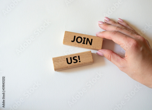 Join us symbol. Concept word Join us on wooden blocks. Beautiful white background. Businessman hand. Business and Join us concept. Copy space