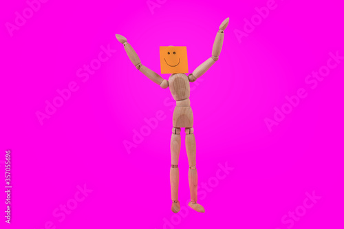 Jointed wooden figure standing holding up arms with a happy smiling face sign on a bright pink background