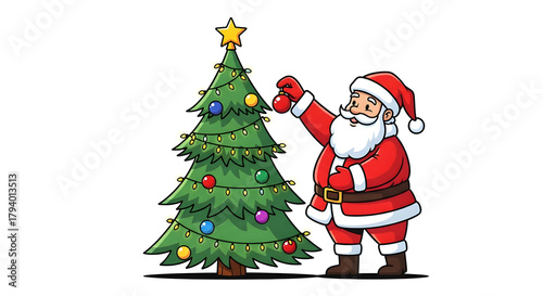 Jolly Santa Claus adorning a festive evergreen Christmas tree with colorful ornaments, bringing holiday cheer to all