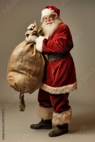 Jolly Santa Claus holding a large sack of presents, ready to deliver holiday joy and cheer.
