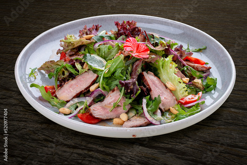 Josper-oven veal salad with sauce. On a dark background, isolated.