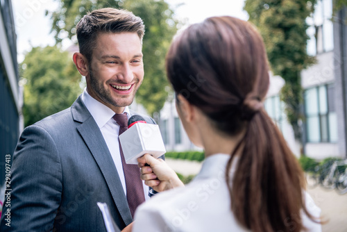 journalist holding microphone and talking with businessman in formal wear