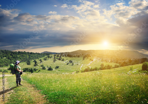 mountain, landscape, plain, path, holiday maker, traveler, woman, green, camouflage, khaki, backpacker, field, tree, sun, sunlight, sunrise, sunset, sunbeam, sky, cloud, cloudscape, nature, outdoors, beauty, pathway, way, walk, hill, wild, dawn, dusk, cloudy, grass, meadow, scene, season, spring, summer, vibrant, looking, distance
