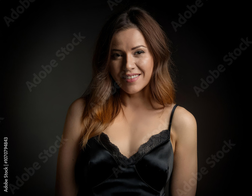 joven mujer atractiva sonriendo con camisón lencero muy seductor negro de tirantes