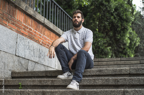 joven sentado en escaleras con ropa casual