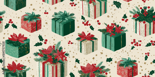 Joyful abstract Christmas vector pattern featuring textured gift boxes, holly, and pine branches in red, green, and gold on a cream background for design, festive fabrics, and packaging