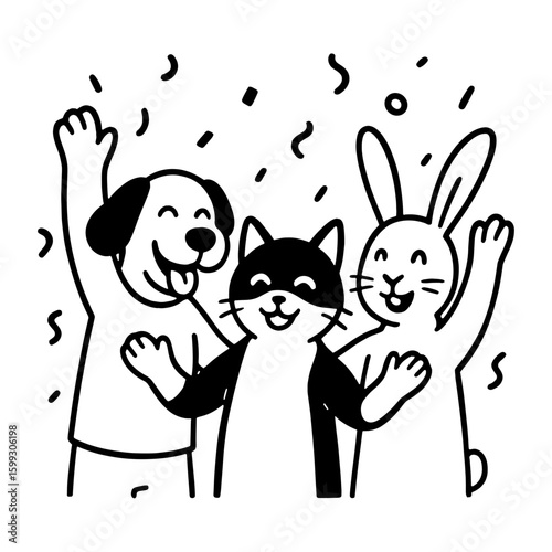 black-and-white, celebrate, illustrated, transparent, background, hand-drawn, cheerful, confetti, isolated, cartoon, drawing, friends, stencil, animal, doodle, joyful, rabbit, vignetting, vector, happy, party, scene, cute, art, cat, dog, fun, animal, celebration, illustration