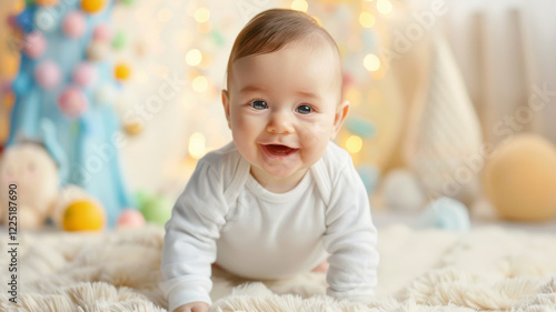 joyful baby is crawling on soft, fluffy rug, surrounded by colorful toys and warm lighting, creating cheerful atmosphere