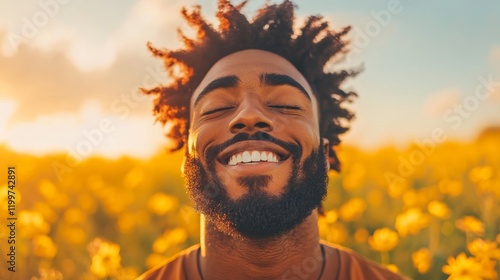 Joyful Black man smiles in a field of yellow flowers during golden hour.